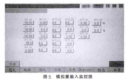 上位機(jī)觸控屏軟件是利用觸控屏供應(yīng)商的組態(tài)軟件設(shè)計(jì)的,作為一個(gè)將運(yùn)用于工業(yè)現(xiàn)場的監(jiān)控設(shè)備,其實(shí)用性和易用性是使用者比較重視的。當(dāng)下位機(jī)的通訊任務(wù)接收到信號量, 主控制模塊就會開始和上位機(jī)通信。下位機(jī)將采集到處理完整的數(shù)據(jù)傳輸?shù)缴衔粰C(jī)內(nèi),上位機(jī)將其顯示到觸控屏上,使用者可以通過上位機(jī)了解空壓機(jī)組的實(shí)時(shí)狀態(tài)。圖5 和圖6 就是模擬量和數(shù)字量各個(gè)通道的實(shí)時(shí)值顯示畫面。