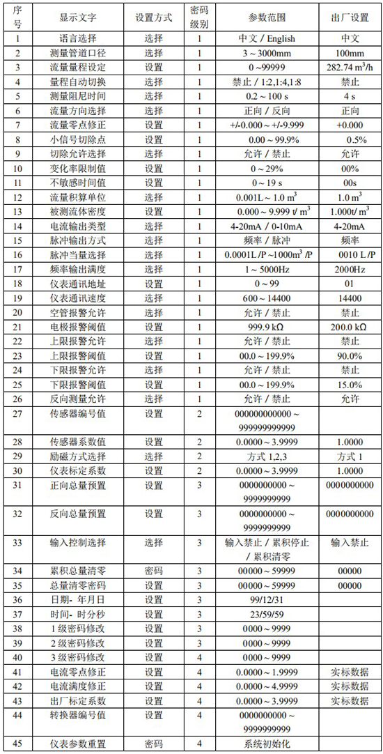 電池供電電磁流量計(jì)參數(shù)決定儀表的運(yùn)行狀態(tài)、計(jì)算方法、輸出方式。正確地選用和設(shè)置儀表參數(shù),可使儀表運(yùn)行在*佳狀態(tài),能得到較高的測(cè)量顯示精度和測(cè)量輸出精度。